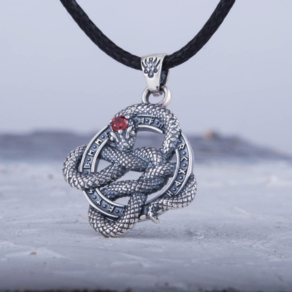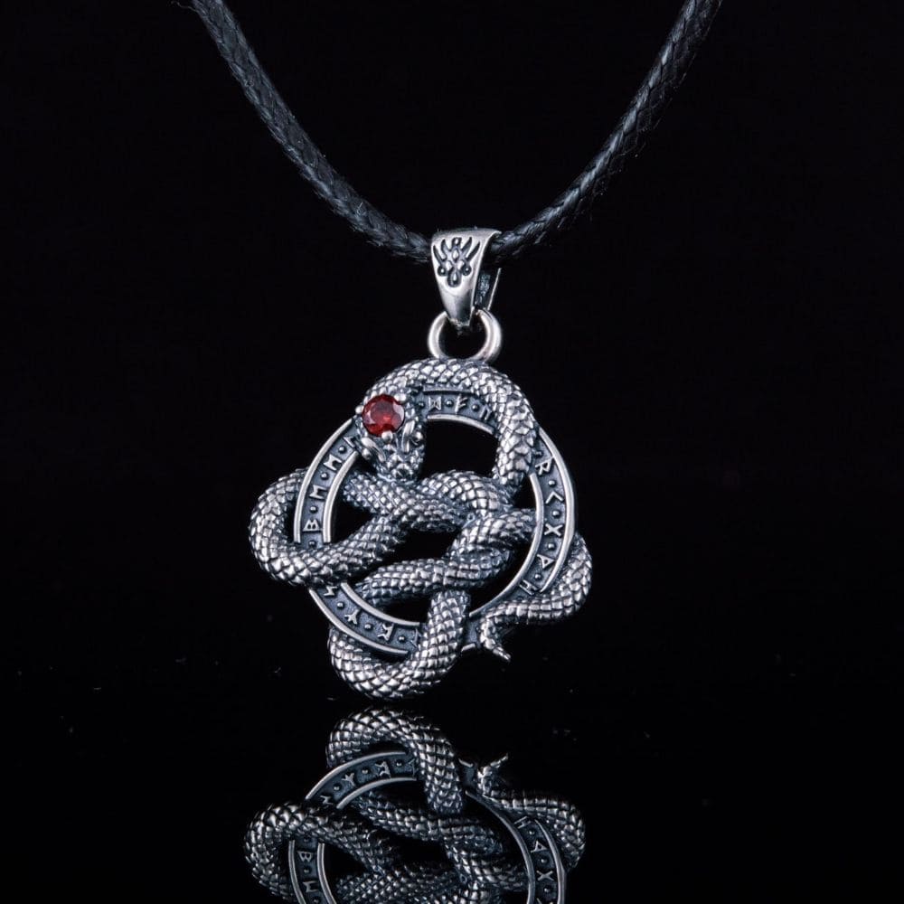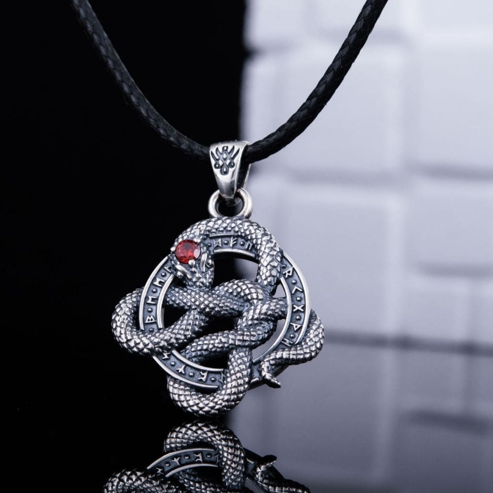 The meticulous details of this pendant make it a unique piece of jewellery. The serpent, painstakingly depicted, coils its body around a ring decorated with runic inscriptions, adorning the piece and giving the pendant an exceptional character.