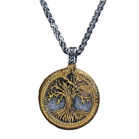 The necklace features an impressive medallion, with the Nordic tree of life in the center and the sea serpent Jörmungandr encircling it.