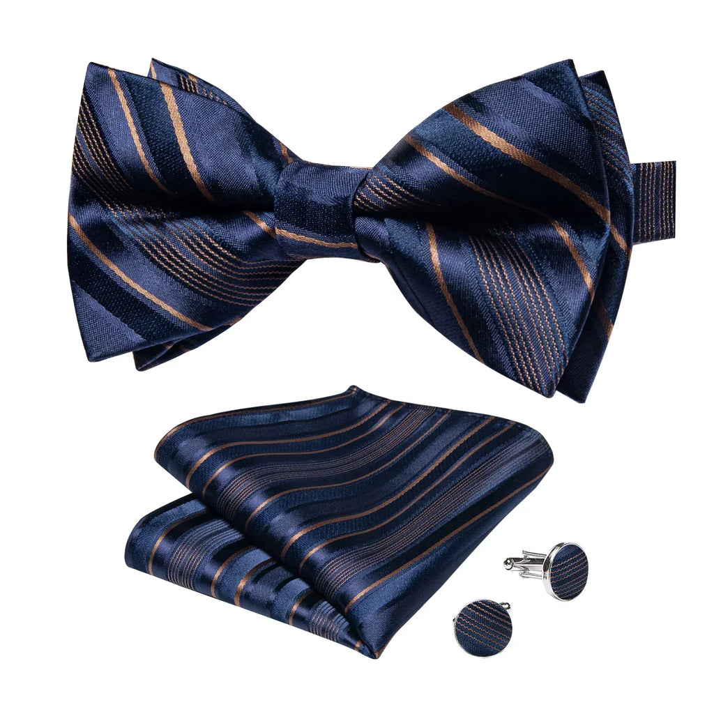 Add a touch of sophistication to your look with this midnight blue bow tie with brown stripes. This versatile accessory is designed for those who appreciate a classic style with a modern twist, making it perfect for both formal and informal occasions. Made with high-quality materials, the bow tie offers a comfortable fit and exceptional durability.