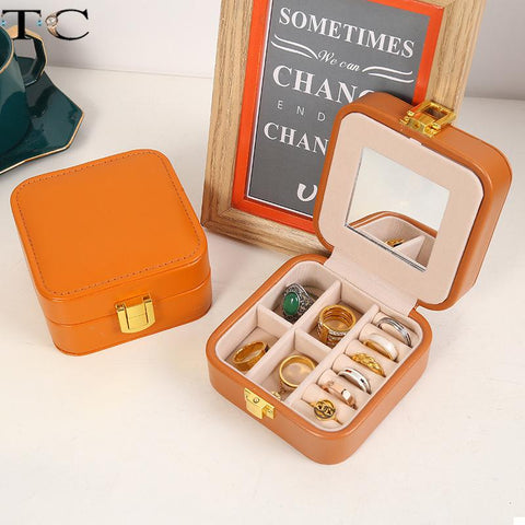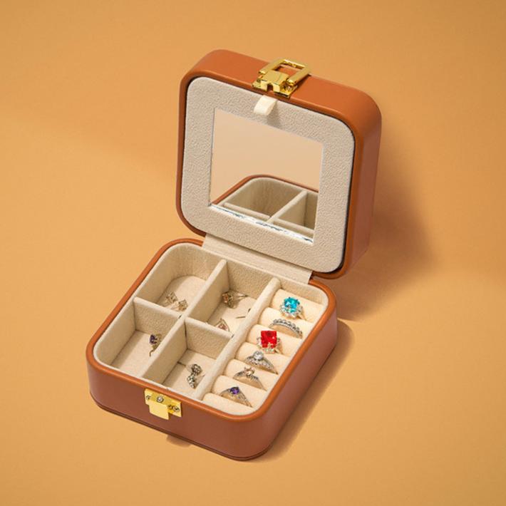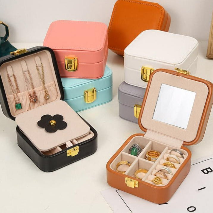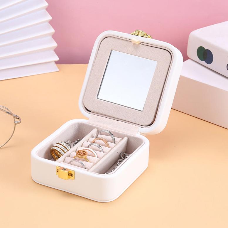 Discover the Mirror Glass Jewellery Box: crafted from premium faux leather with a cosmetic mirror, elegant gold clasp, and dedicated compartments.