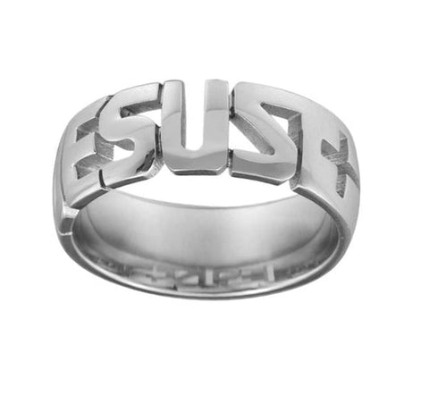 High-quality stainless steel religious ring featuring Jesus. The name Jesus is delicately carved in a modern and contemporary style. A Christian cross is engraved on the sides using high heat. Wear on your finger as a symbol of Christ's complete protection and love.
