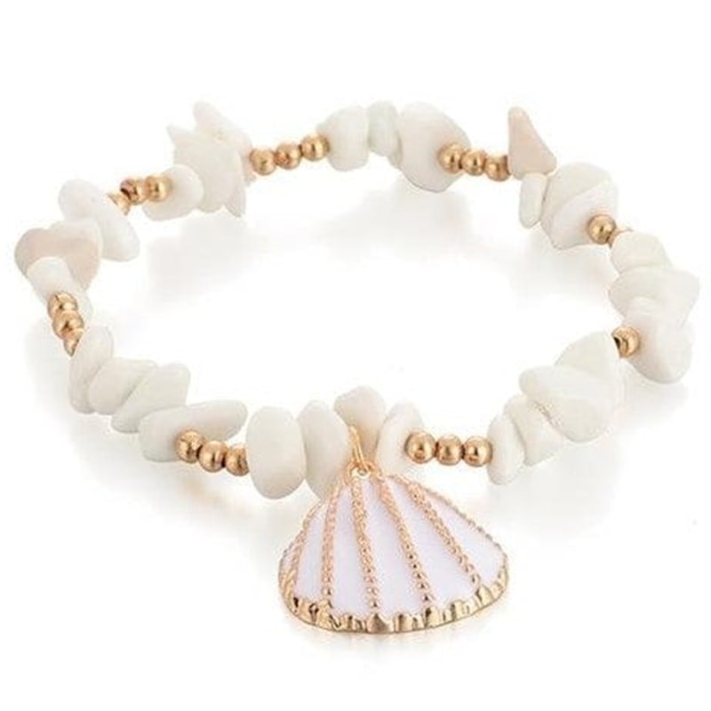 Jet off to an exotic destination with this trendy shell bracelet! Its white stones and scallop shells undoubtedly evoke the fine sandy beaches, volcanoes, and palm trees of a paradisiacal island.