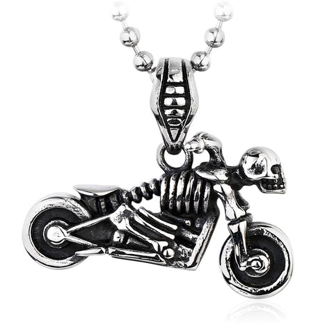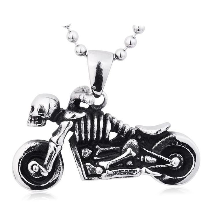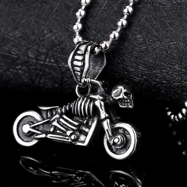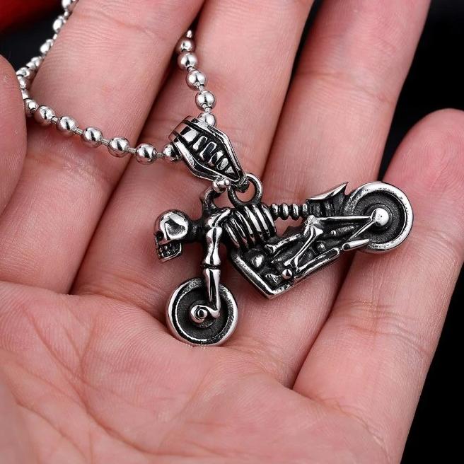 This motorcycle pendant necklace is the perfect blend of bike and skull and crossbones - an original and unique concept that will surely delight you!