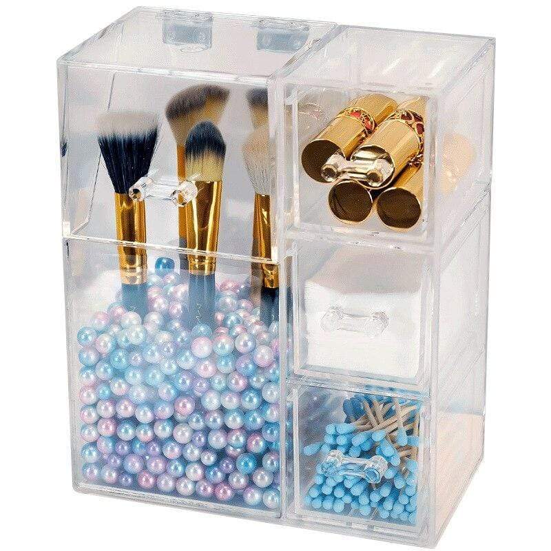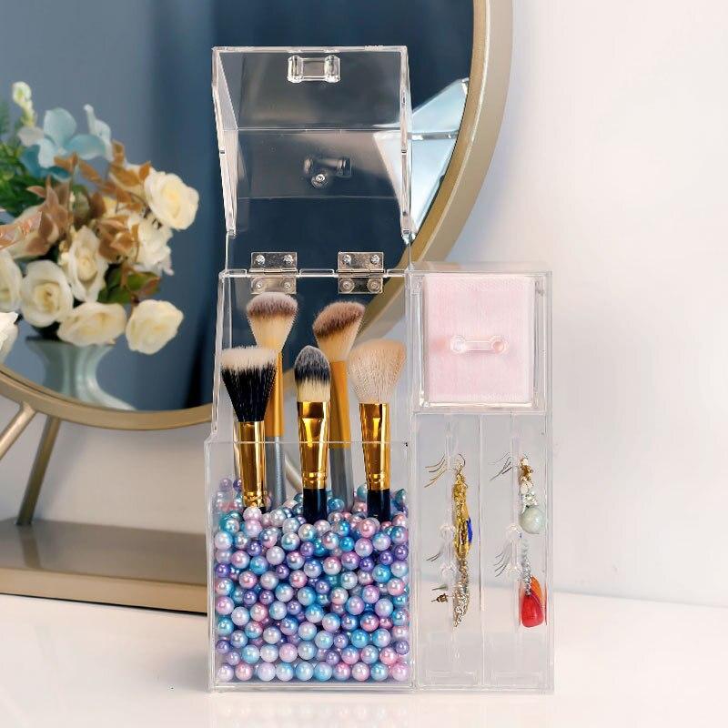This multifunctional makeup holder allows you to easily store makeup brushes, lipsticks, and all your cosmetic products. To do this, small white balls are needed which keep the brushes horizontal without touching each other. The box also has drawers for storing other products, accessories or even jewellery.