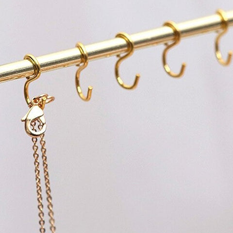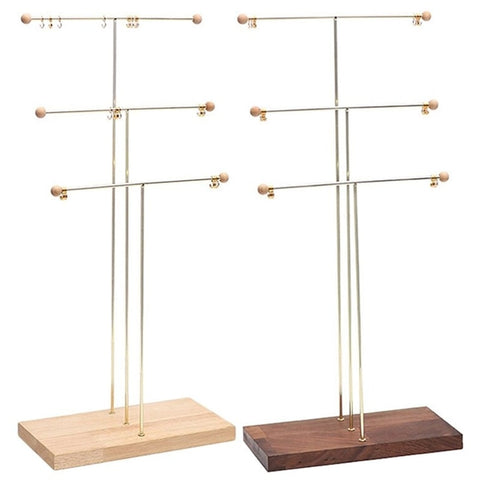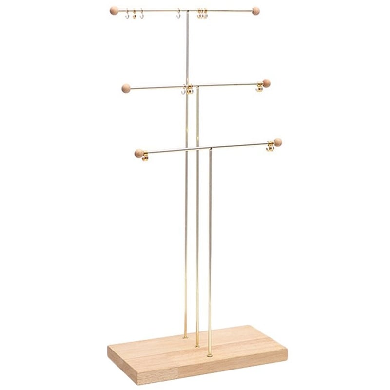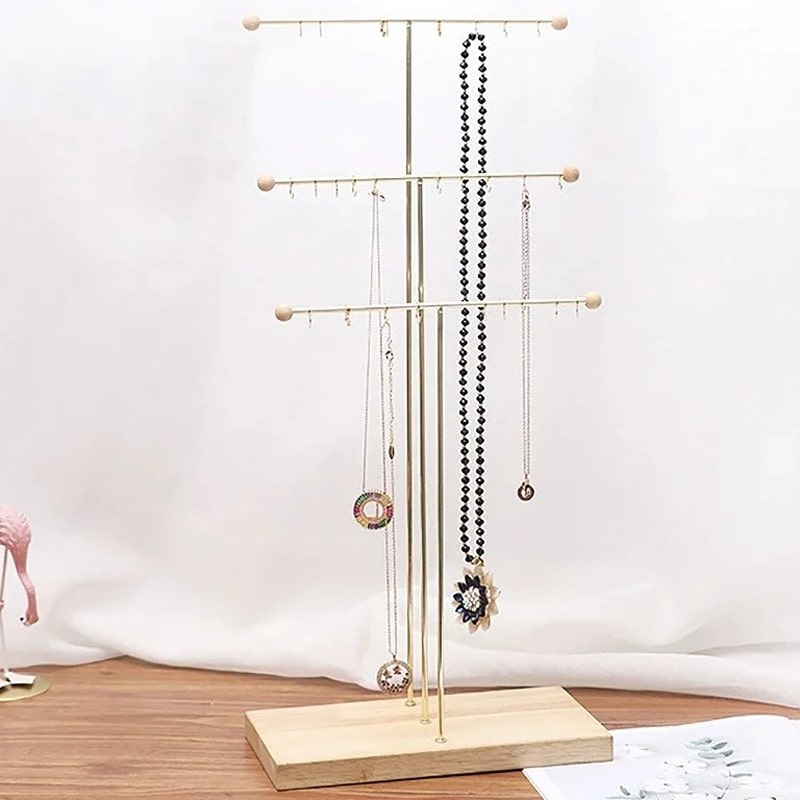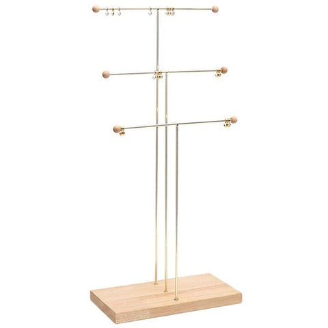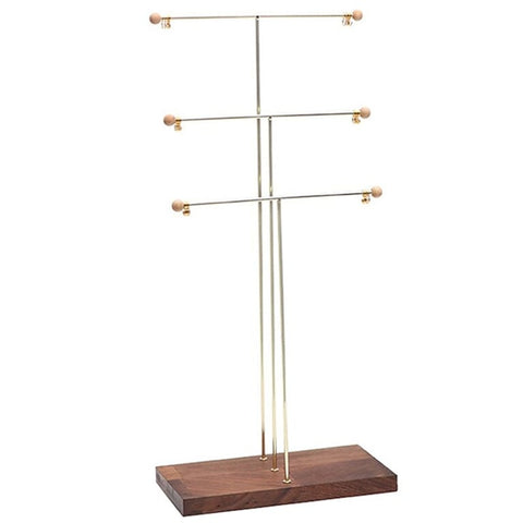With three levels of storage, this classic necklace holder is perfect for organizing a large jewelry collection! The base is made of solid wood. It includes small hooks, extremely handy for hanging necklaces and pendants. The total height is 49 cm, and on the lower level, you can store long necklaces without them touching the wooden base.