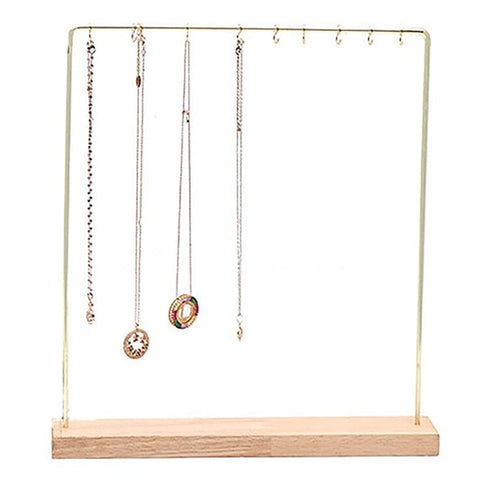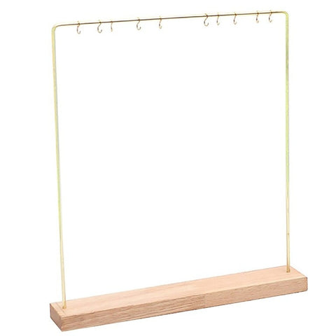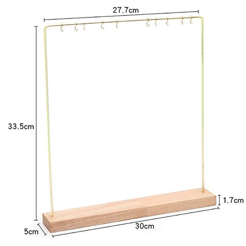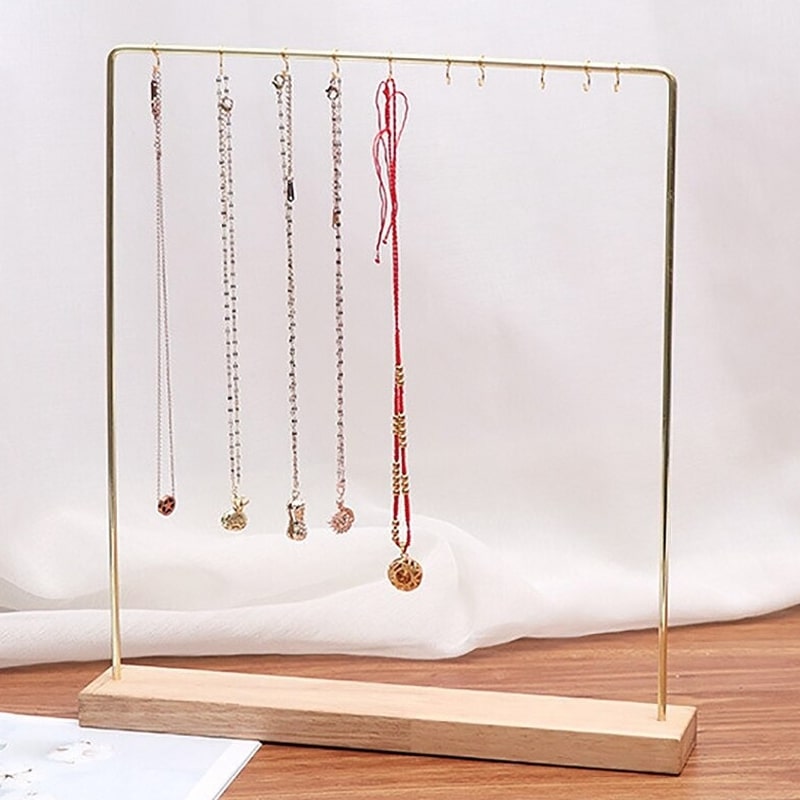 This simple necklace holder showcases your favourite jewellery. Hang long necklaces and pendants on the dedicated brass hooks. You can also hang bracelets and earrings on this jewellery holder. The solid wood base ensures excellent stability.
