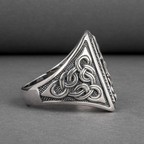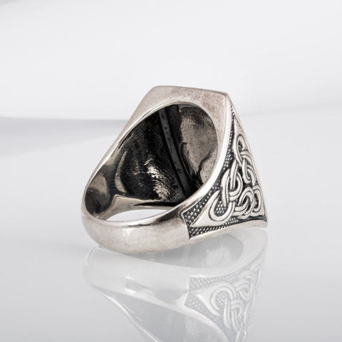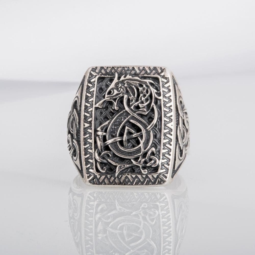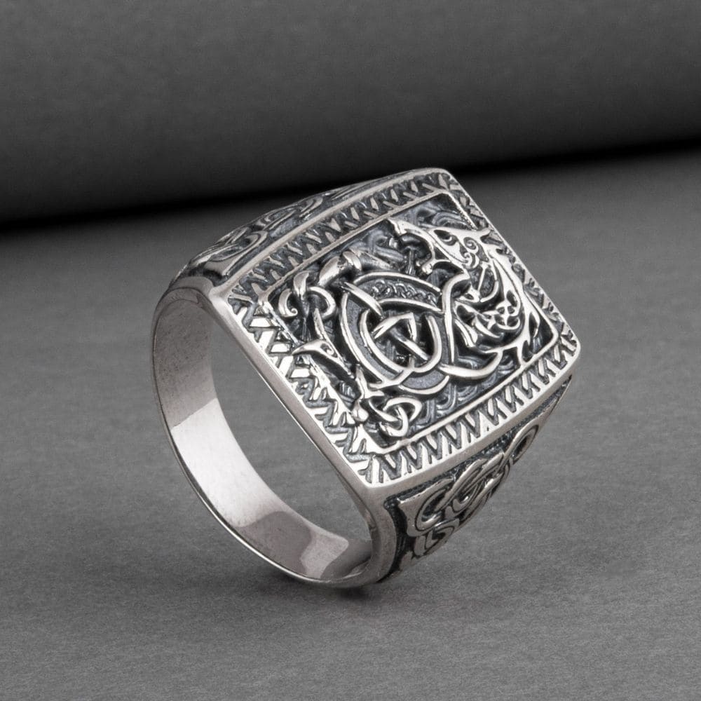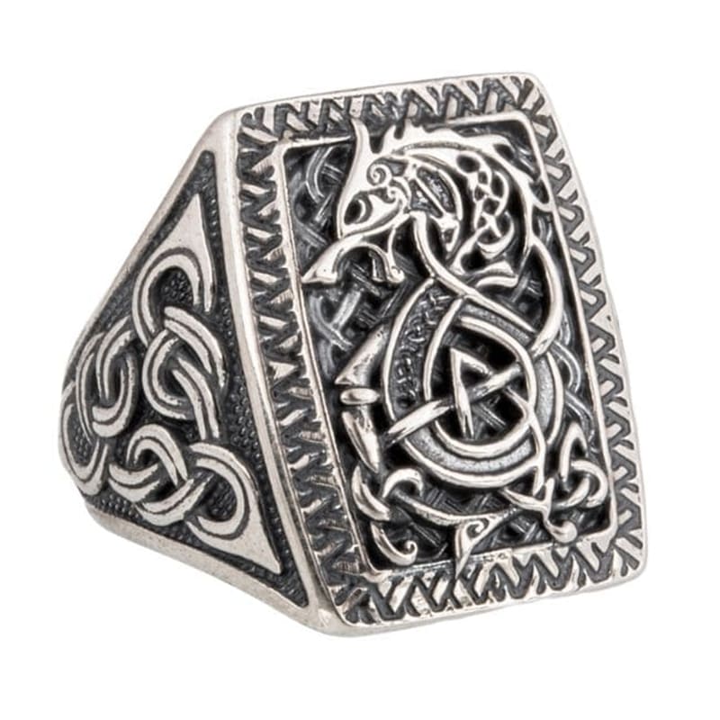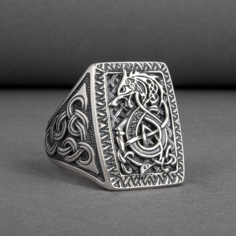 Embrace the legendary symbol of the Nordic wolf with this Fenrir silver signet ring. The fierce wolf is stylishly depicted with striking interwoven motifs, faithful to Scandinavian art.