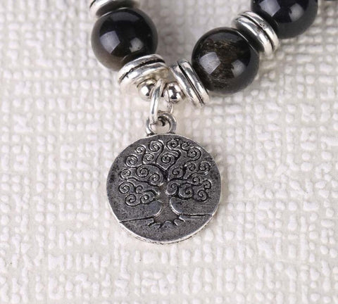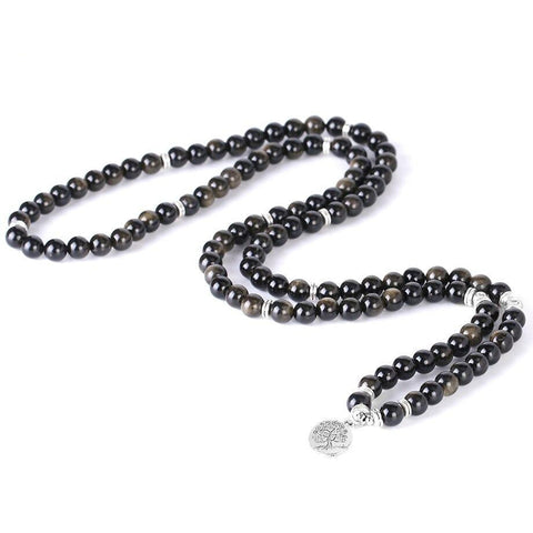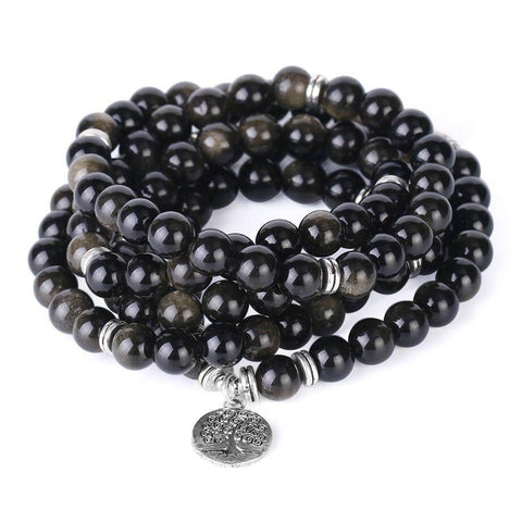 Obsidian is a stone of many virtues. Its properties are recognized by lithotherapists and jewellers, and it is currently used in the creation of jewellery, such as this protective Mala bracelet with 108 obsidian beads. Thanks to its detoxifying effect, this obsidian bead bracelet helps to alleviate various ailments, such as rheumatism and cramps, and regulate blood circulation. On a spiritual level, this bracelet with the tree of life can solve problems caused by energy flow blockages. It's an excellent shield against the evil eye and negative vibrations, promoting spiritual wholeness.