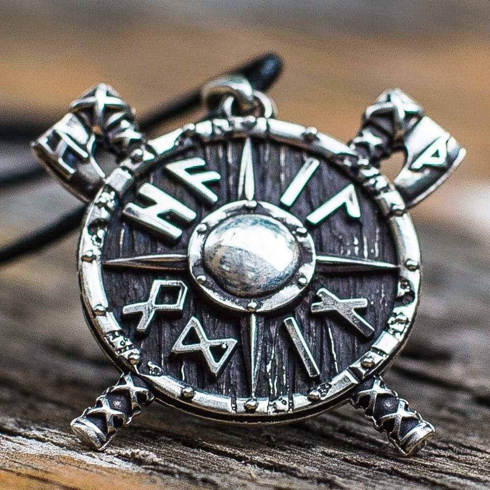 This elegantly designed shield-shaped necklace in silver features Nordic runes that spell the word Hail Odin.
