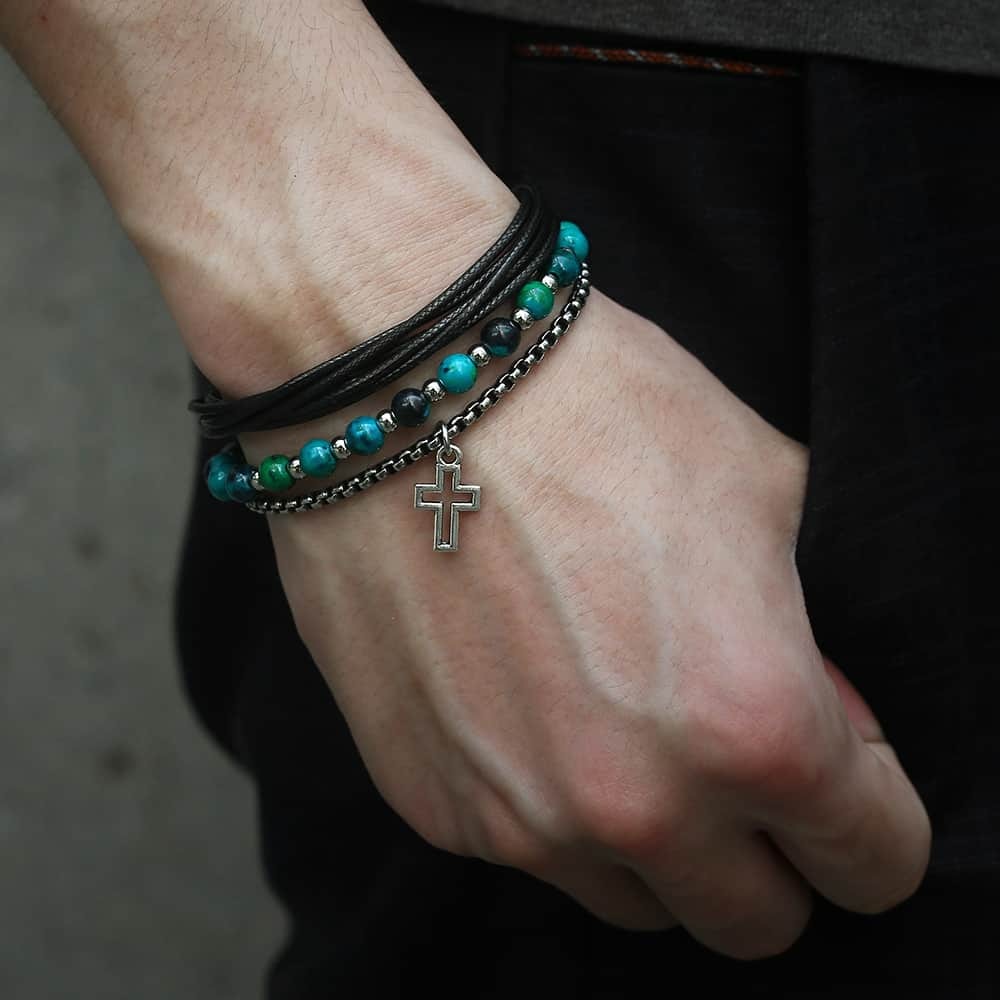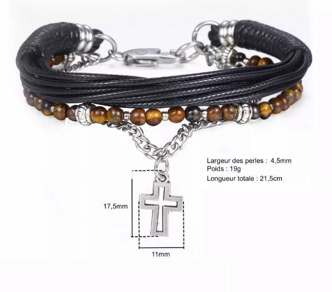 Complete your look with this set of Christian leather bracelets, decorated with either blue or brown onyx beads (depending on the model), interspersed with metallic beads and a delicate thin-link stainless steel chain. This stunning bracelet will win your heart, and you can wear it confidently throughout the day thanks to its extremely secure lobster clasp!