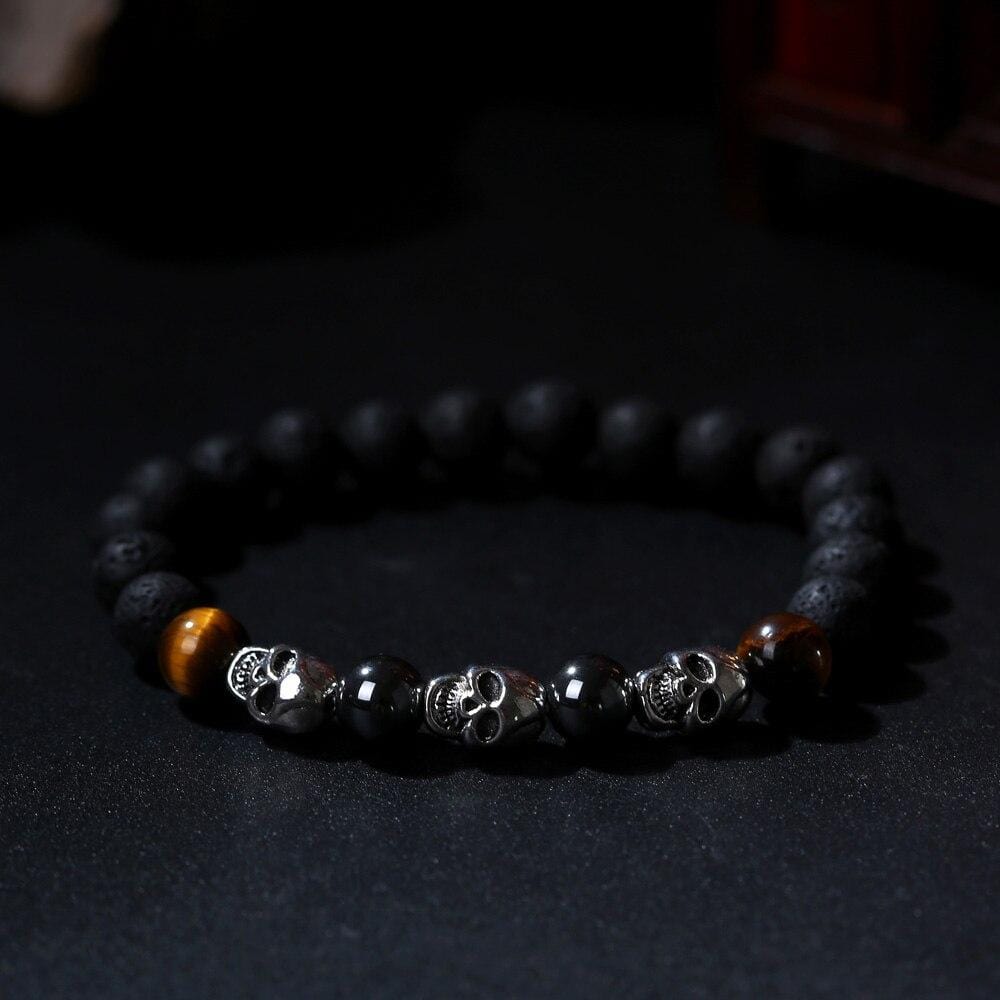 This skull bracelet has a truly deadly look. It is made from various natural stones, such as lava stone and onyx. The three skulls on the front of the bracelet are made from silvered steel, giving it a 100% cohesive and masculine style.
