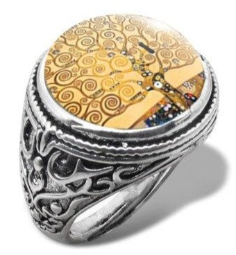 Discover a truly original ring that portrays the famous Tree of Life by Gustav Klimt! This jewellery piece is available in two versions: gold or silver.