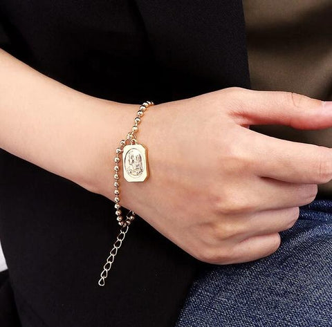 The Ahoa team is proud to present this magnificent Our Lady bracelet, handcrafted by our artisans with the utmost quality. A rare, sophisticated, and elegant bracelet, adorned with a medallion finely engraved with the image of the Virgin Mary, Mother of God. The Virgin Mary is known by many names, such as Our Lady, Mother Mary, Virgin Mary, Mother of God... Mary watches over all of humanity with maternal care, for, according to Christian faith, she is the mother of the Saviour of the world, Our Lord Jesus Christ. Express your gratitude with this sublime Our Lady bracelet, which beautifies your wrist with elegance and style. This high-quality Our Lady bracelet comes equipped with a lobster clasp, accompanying you in your daily tasks and illuminating your day with all the kindness of Mary, Mother of God.