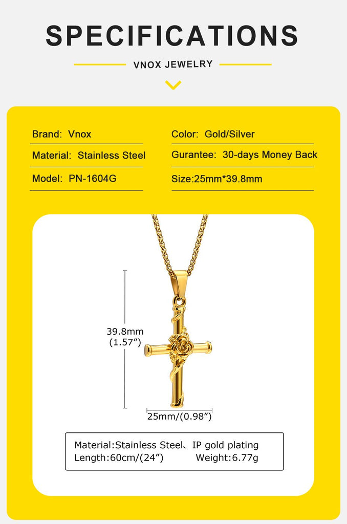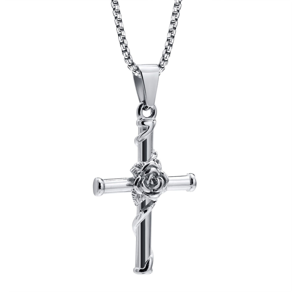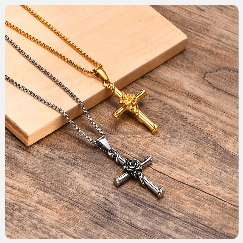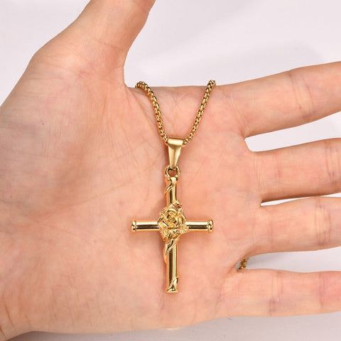 This striking cross is embellished by a magnificent rose, giving it a touch of beauty and delicacy. Roses are often considered one of the most beautiful flowers, frequently symbolising love. The rose on this necklace expresses your immense love for our Lord God and all that He provides us with each day.