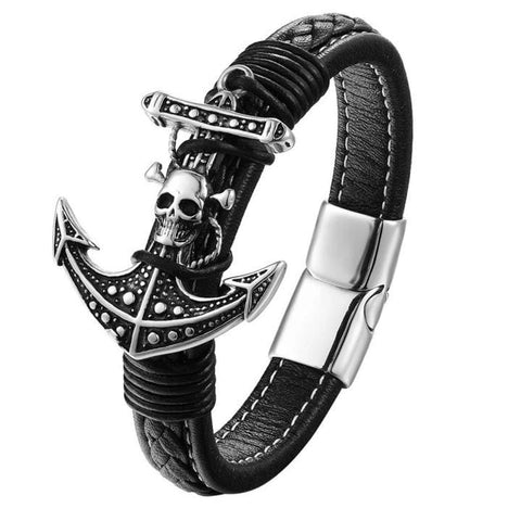 Leather Bracelet with Anchor and Pirate Skull for Men