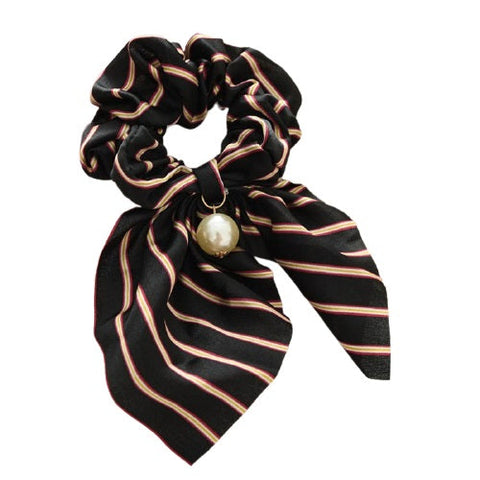 Black hair elastic with subtle stripes. A subtle and elegant style for this scrunchie with a bow accentuated by a pearlescent pearl. A scrunchie that enhances your hairstyle with a personal and romantic touch.