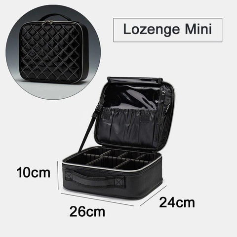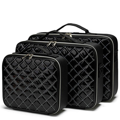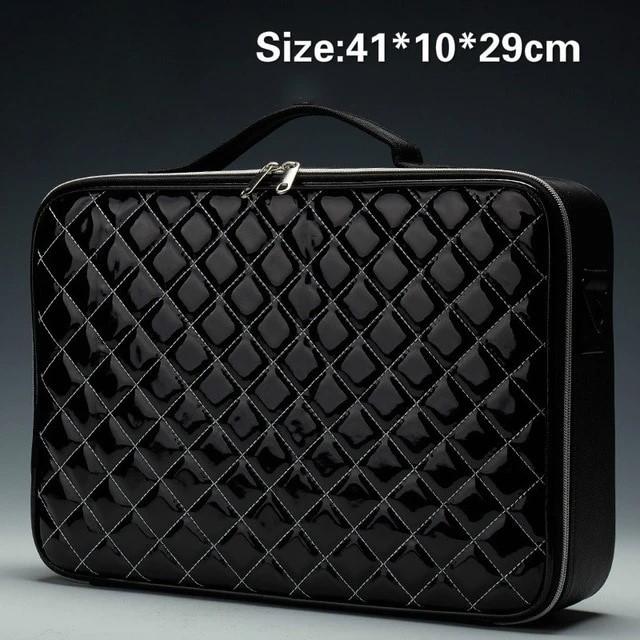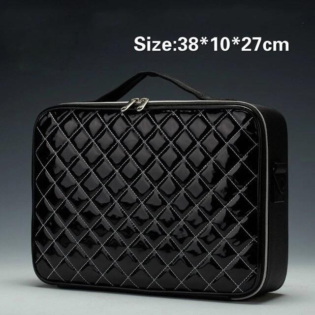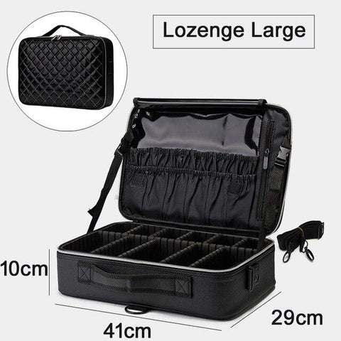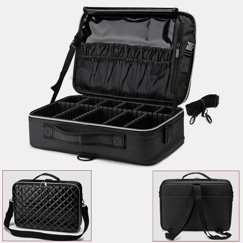 It's the professional makeup bag! With a shoulder strap included, you can keep your hands free to do as you please. It's also perfect as carry-on luggage on a plane. It has internal and external pockets for all your items, as well as elastic bands that keep your brushes, toothbrush, and toothpaste safe and secure. The bag, made from PU leather, is sturdy and stylish.