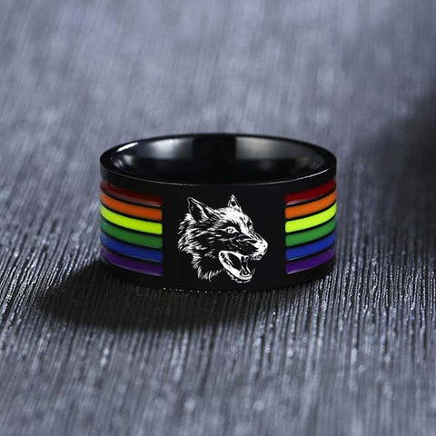 The Sateenkaarisusi Wolf Ring enhances the majesty and strength of the wolf with a magnificent colour palette resembling a rainbow and an original engraving of this totem animal's head. Its black colour adds a touch of luxury and elegance to your look. Its striking design combines the simplicity of the ring with the splendour of the colours, creating an unusual balance between serenity and vivacity. Embrace this modern model to express your passion for wolves in style.
