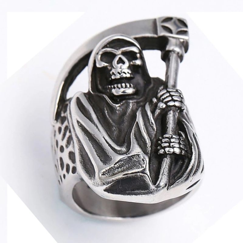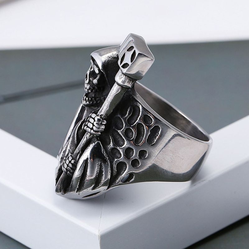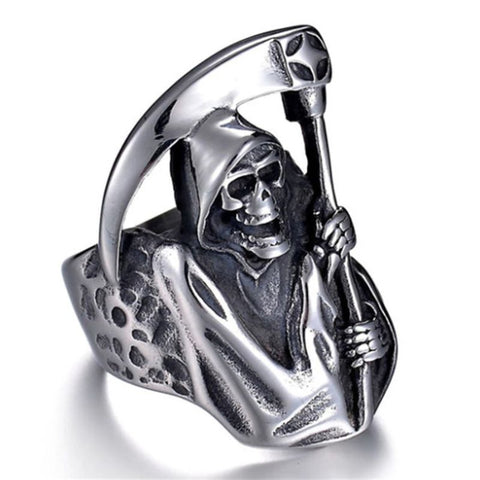 This stainless steel signet ring is a unique gothic piece, with a faithful reproduction of the Reaper's skull. Made of stainless steel, this piece won't rust or lose its colour over time.