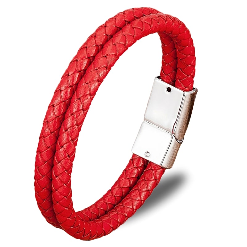 If you want to add vitality to your look, the red leather double bracelet for men adds a vibrant touch to any outfit. Thanks to the steel clasp, it's easy to put on and take off your wrist, making it perfect for everyday wear, even when you're in a hurry. Whether you use it daily or occasionally, this red leather men's bracelet has everything you need for a style full of energy thanks to its striking scarlet colour.