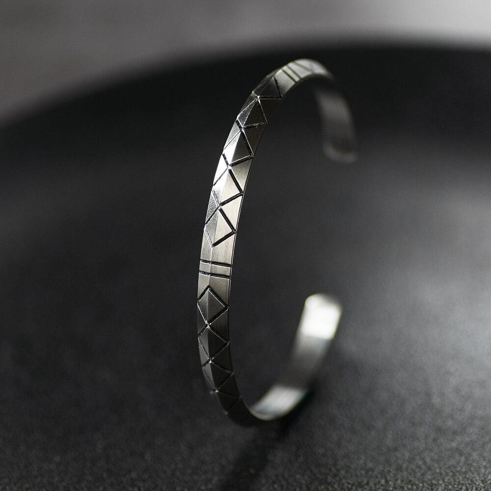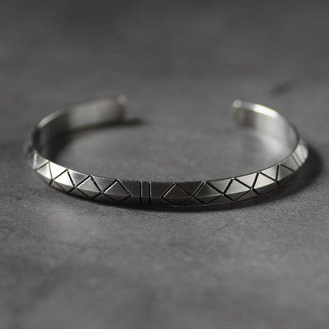 This rigid silver bangle, engraved with perfectly symmetrical triangular shapes, is a high-quality accessory. The silver stainless steel gives the bracelet an extremely elegant shine.