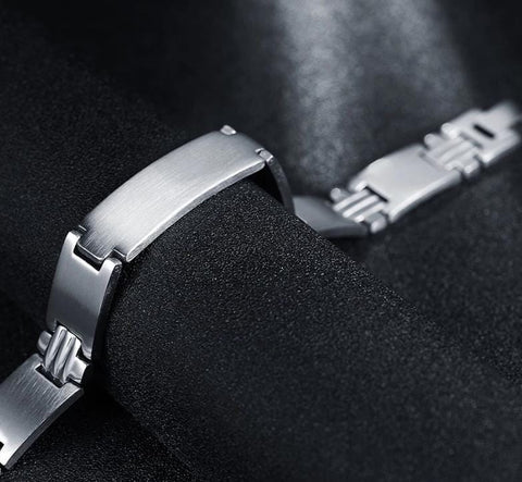 This robust stainless steel armour link bracelet, mechanically polished to a mirrored finish, is a timeless and beloved piece of jewellery. Its shiny finish provides a luxurious silver tone that complements any look.