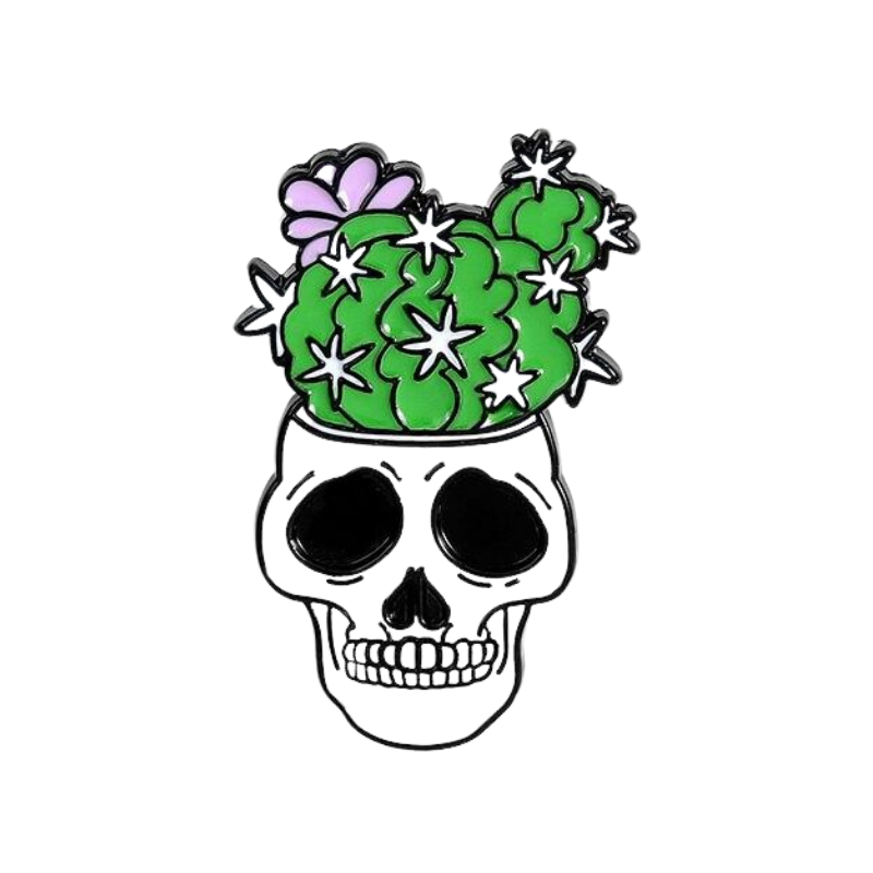 Wear this rock & roll pin with pride! A skull-shaped accessory with crossed bones, featuring a cactus in place of the brain. Watch out for the thorns!