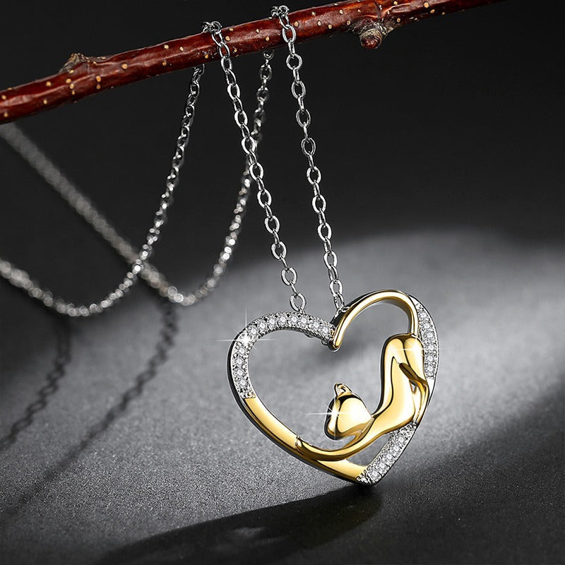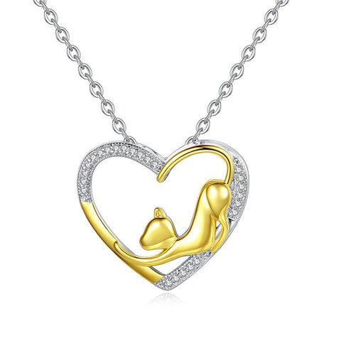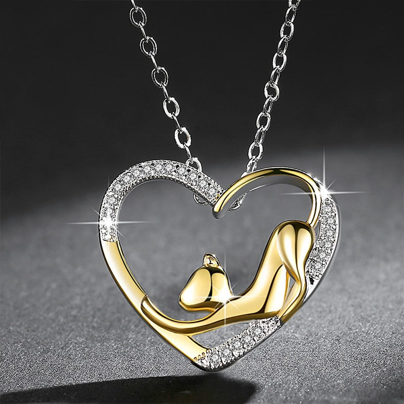 Are you likely one of those many women who adore cats? Wearing this romantic necklace with a cat pendant undoubtedly demonstrates your love for these felines! An elegant, slender cat awakens from its nap, stretches before taking a little stroll to its bowl. It's golden and is surrounded by a beautiful heart adorned with delicate white crystals. This charming cat necklace is original and elegant.