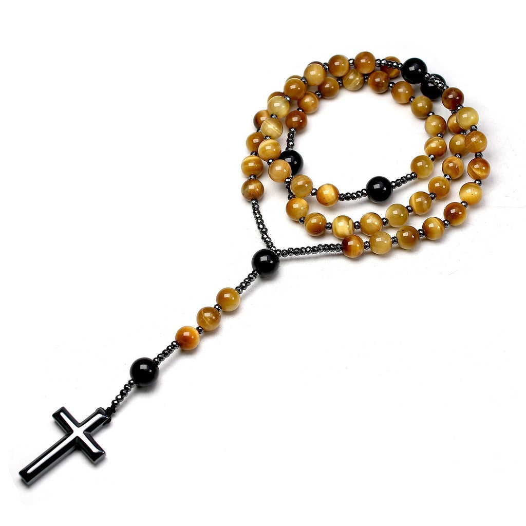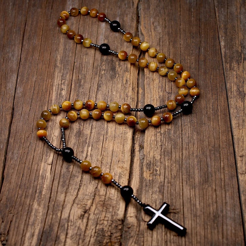 This magnificent piece of jewellery is made with polished tiger eye beads, onyx, and hematite for the cross. It's an ideal gift for a Christian who believes that God created stones that can be used in lithotherapy to heal certain ailments.