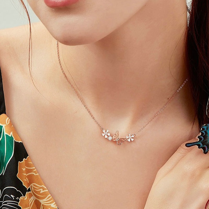 This beautiful rose gold flower necklace stands out for its original design. Thanks to the flowers and the butterfly in the center, it's a feminine piece of jewellery that can be worn daily and enhances your style.