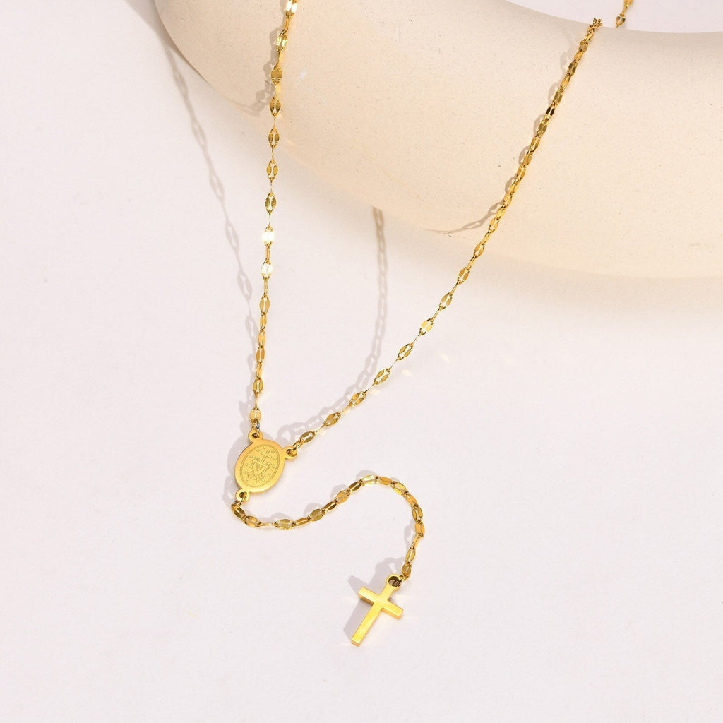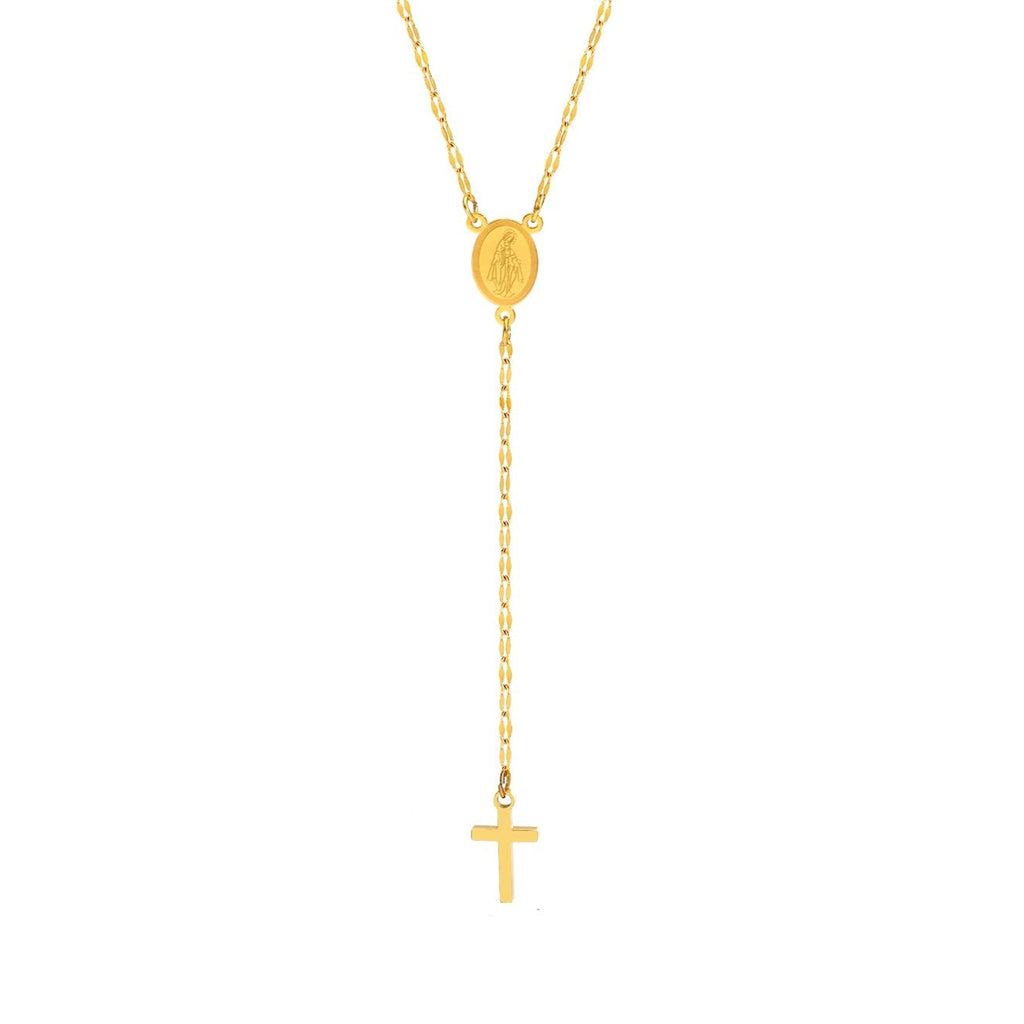 This 60 cm Rosicrucian necklace, made from golden stainless steel, offers an elegantly and carefully crafted design. The medallion featured on the necklace represents the Virgin Mary, a symbol of strength and protection.