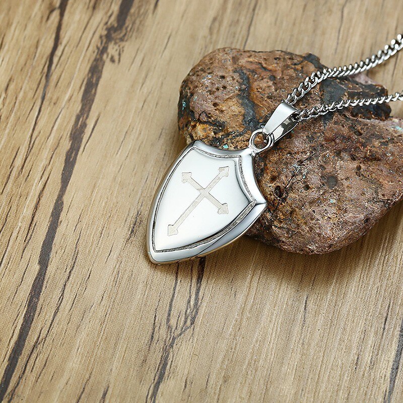 This necklace, made from stainless steel, draws inspiration from the world of fantasy and, in particular, the paladins. Inspired by historical crusaders, these figures are often depicted in heavy armour and are both resilient and powerful. On the back of the pendant, you'll find an English Bible quote. Specifically, it's Joshua 1:9.