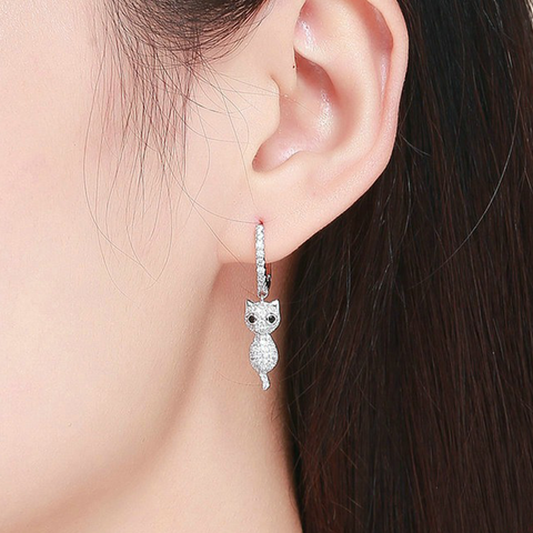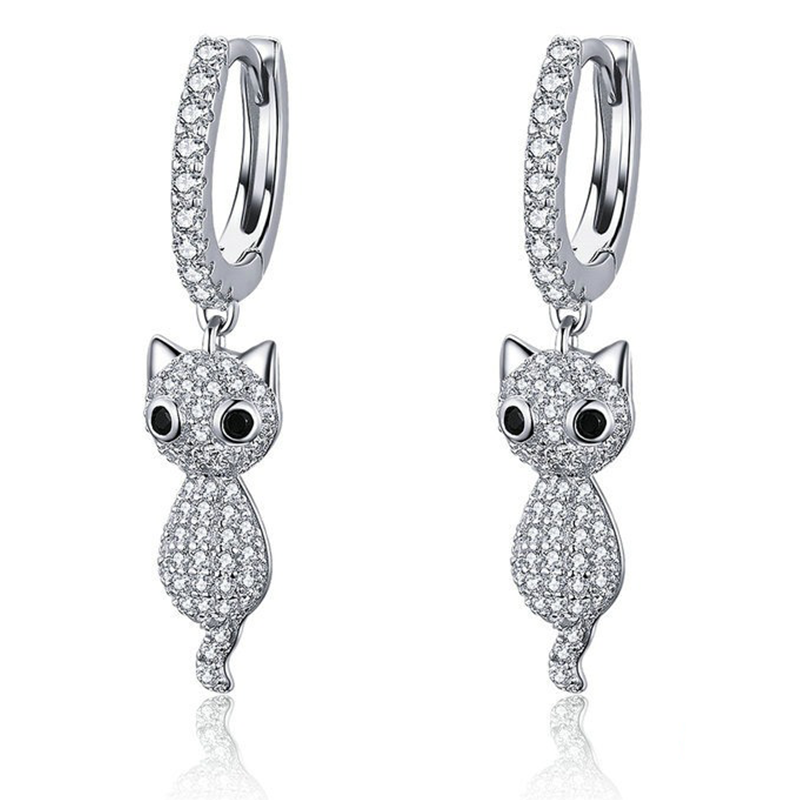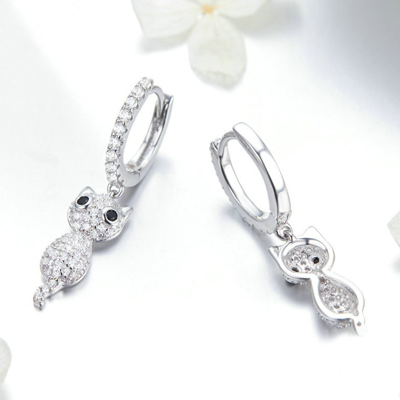 Adorable and Shiny Silver Cat Earrings with Rhinestones.