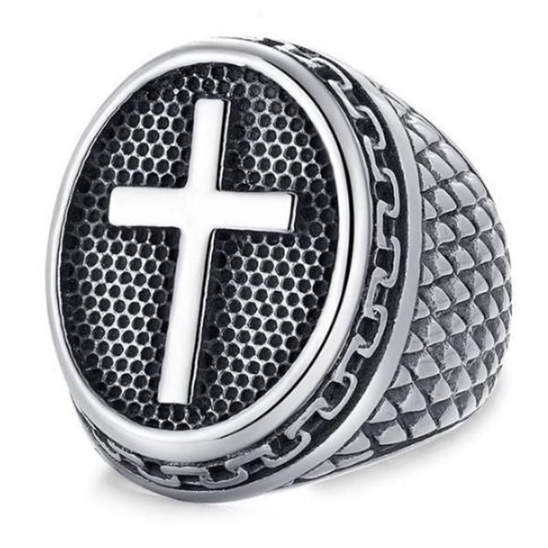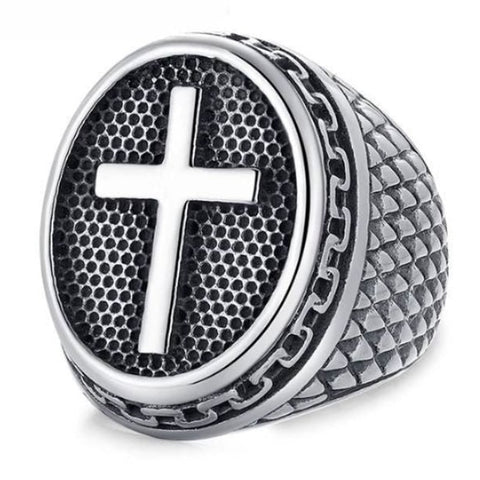 This stunning signet ring features an oval surface adorned with a Christian cross. The ring is decorated with geometric engravings that give it a traditional look. This signet ring pairs perfectly with other religious jewelry, such as a rosary.