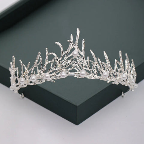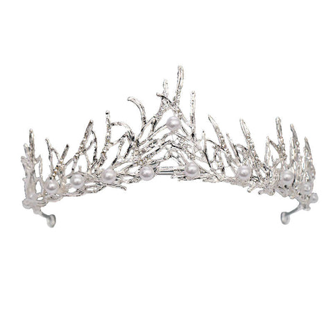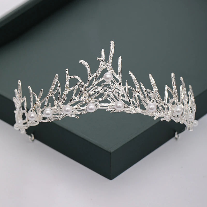 A lovely silver crown adorned with pearlescent pearls for women. A fantasy crown worthy of the most beautiful fantasy stories. A crown that also conjures images of ice pendants cut like noble gemstones.