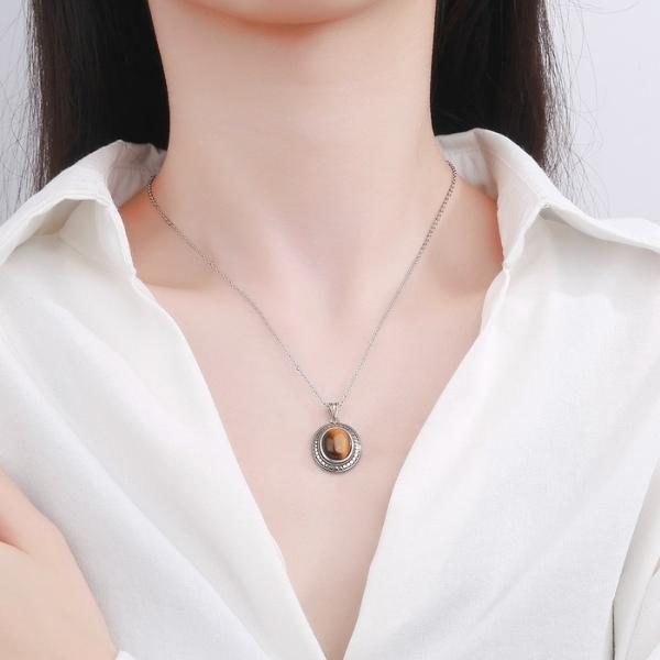 Tiger Eye Pendant for Women in Silver and Natural Stone, Chain Included.