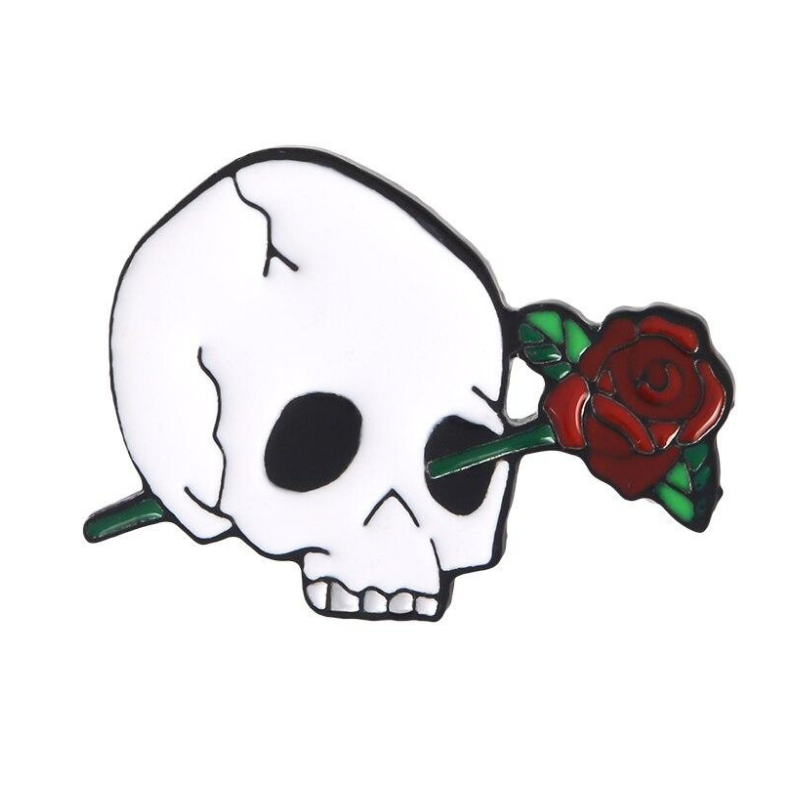 Here is a romantic skull-shaped pin! A small emotive skull, pierced by a red rose in the eye, exudes a special charm.