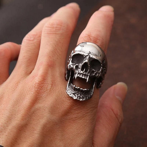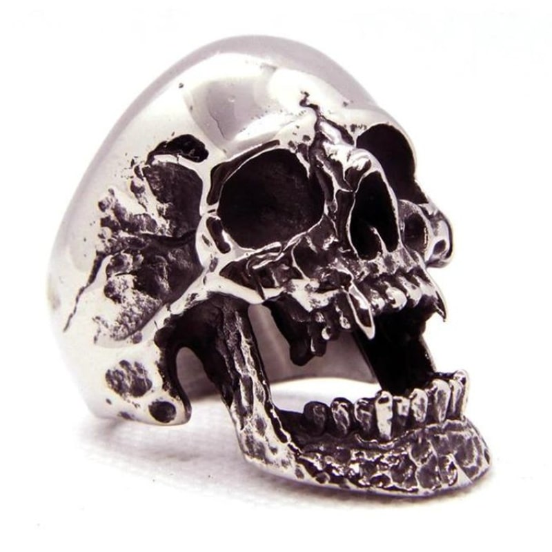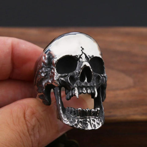 This skull-shaped signet ring is striking and not easily overlooked. The ring features realistic vampire teeth that give it a striking look. This large-sized ring adds a touch of gothic rock 'n' roll to your look on any occasion.