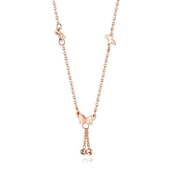 This charming necklace is made up of a link chain decorated with two small butterflies on each side and a butterfly pendant in the center. The latter is situated above a small ring, from which hang two beads suspended by small chains. This stainless steel butterfly necklace is accentuated by a rose gold coating, giving it a feminine touch and softening its structure.