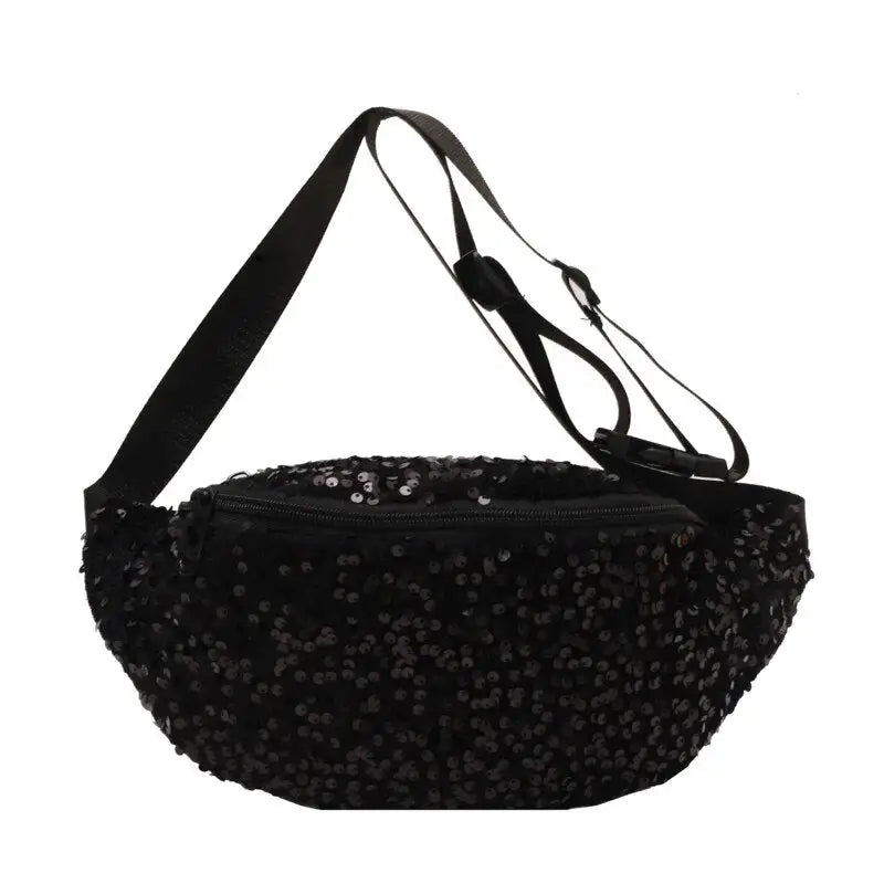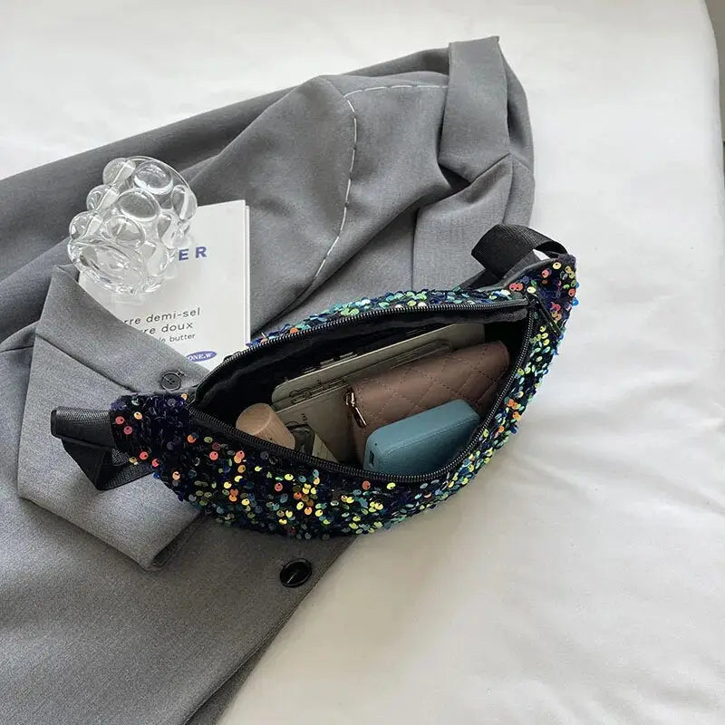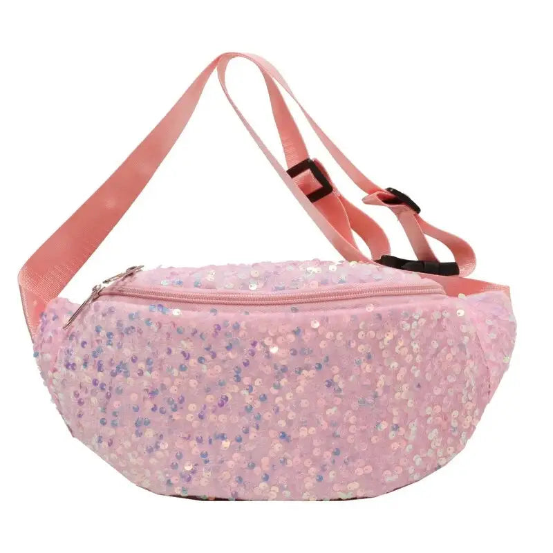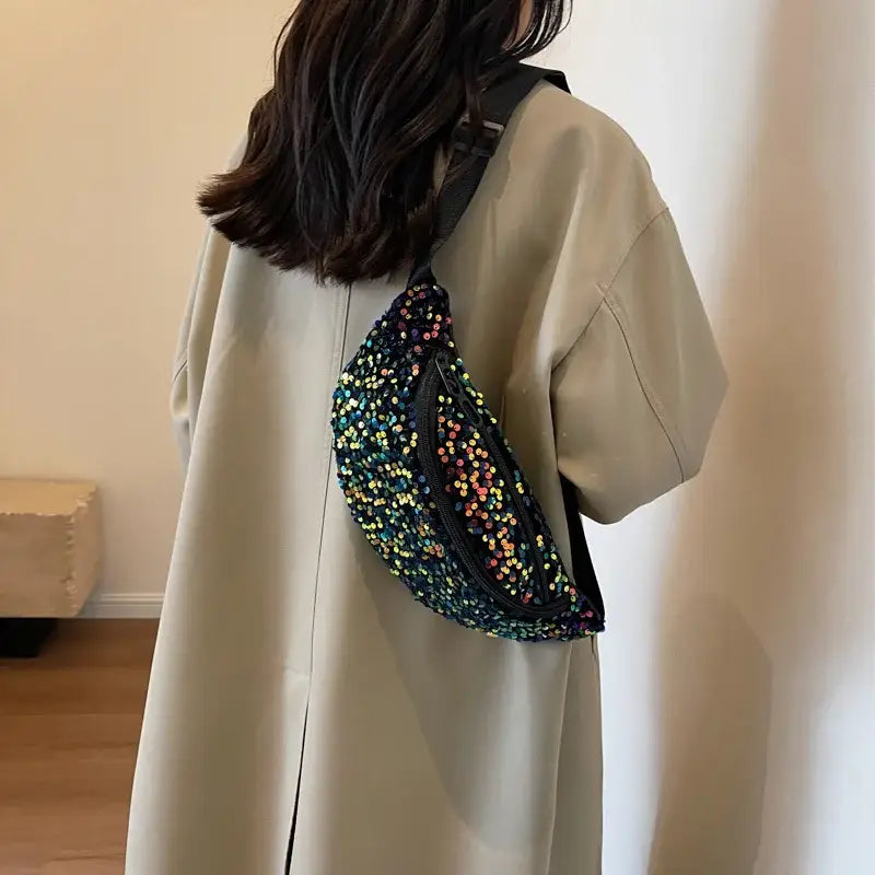 This sparkling bum bag is designed to add a touch of shine to your look while providing the convenience of a lightweight bag. This fashion piece is perfect for festivals, parties, and any occasion where you want to sparkle!