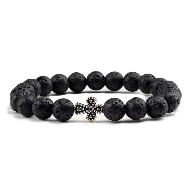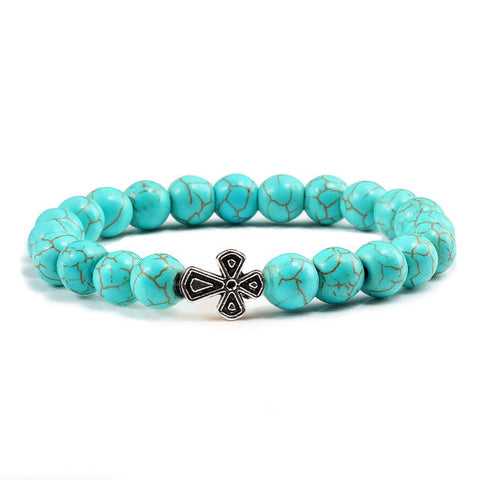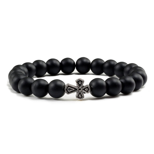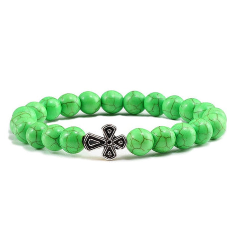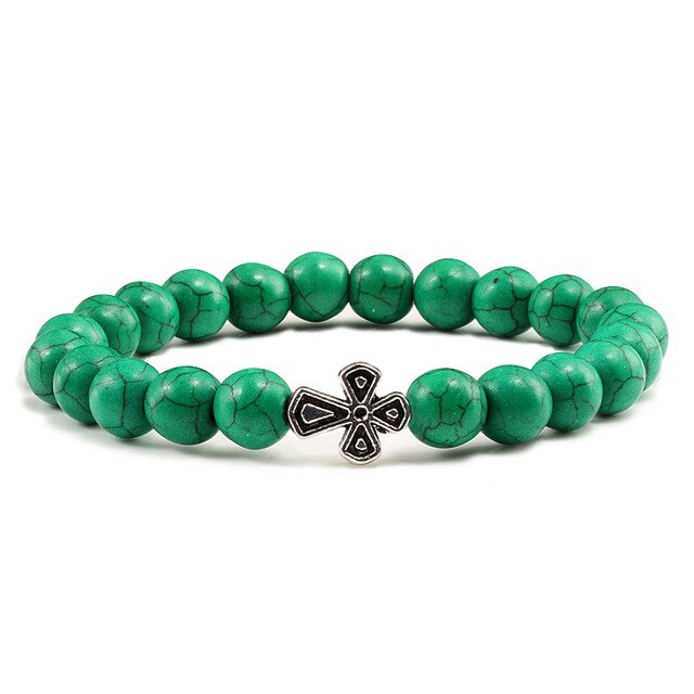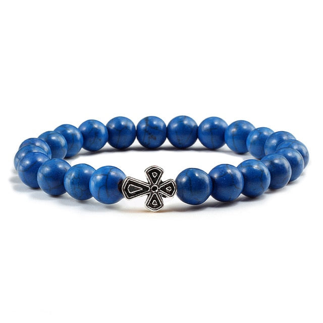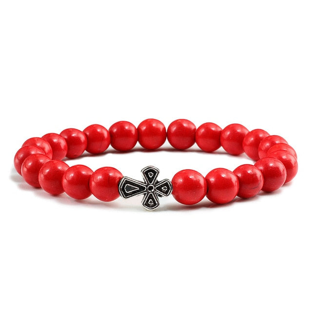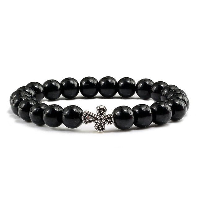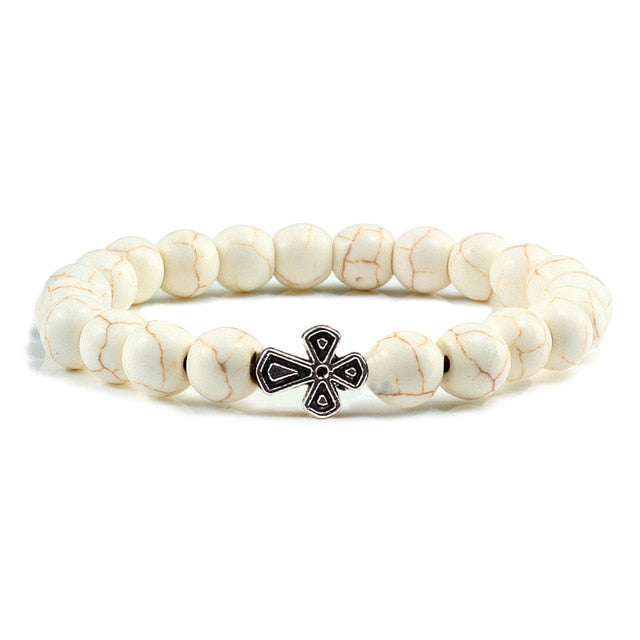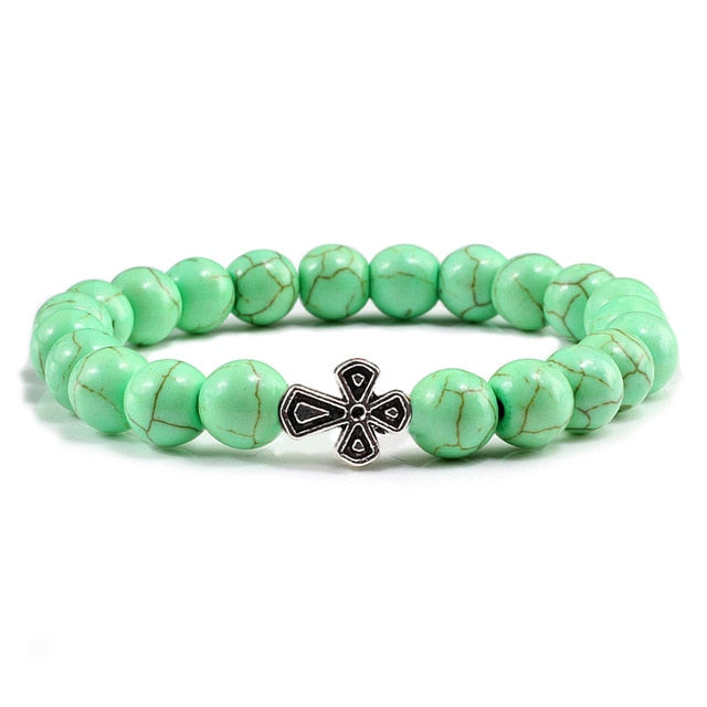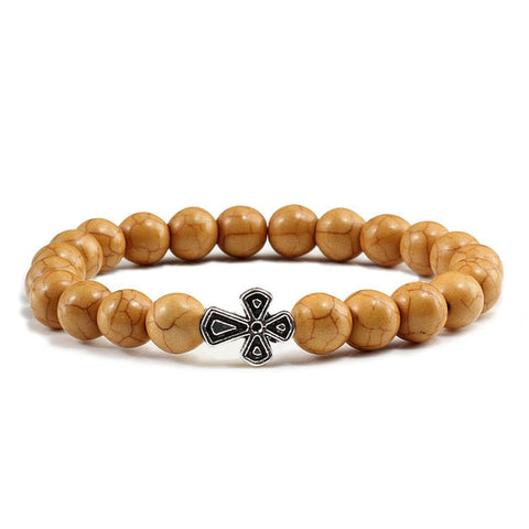 Bracelet with a cross on an elastic cord (perfectly adapts to all wrists) and natural stone beads. The cross, the most important symbol of Christianity, is delicately engraved. Wear on your wrist all the love and protection of Christ in style.