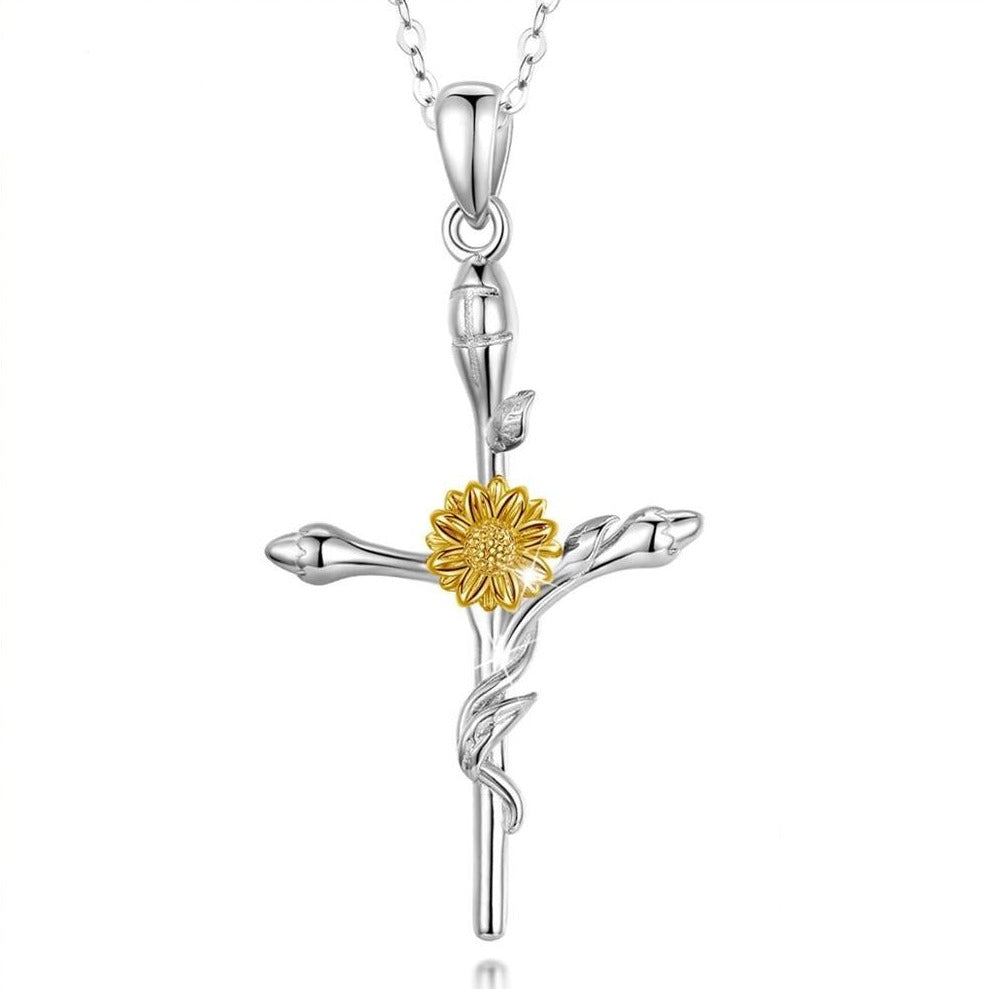 Treat yourself to a beautiful cross necklace from our shop! This model is decorated with a golden sunflower. It looks wonderful around your neck.