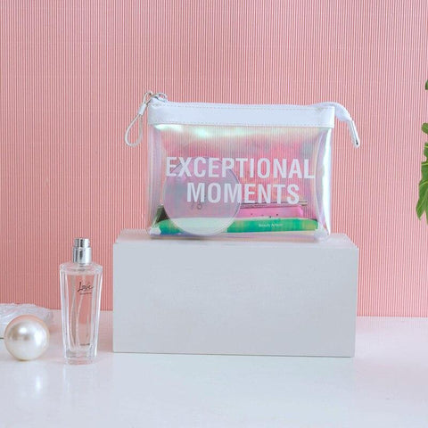 As the name suggests, the teenager's makeup case was created to store makeup utensils. It's a very stylish case, with transparent rainbow colours — everything that's in trend. It weighs only 80 grams, making it quite light, and is available in large, medium, and small sizes, depending on your tastes and needs. It's a great choice for storing your makeup products at home or on the go. The teenager's makeup case is made of PVC, a material known for its durability, and it's simply wonderful.