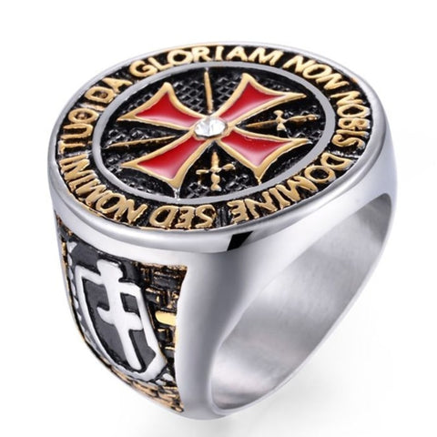 This signet ring features a detailed design with a round face, at the center of which is a cubic zirconia stone. The Templar's red cross is engraved, along with Latin inscriptions. This two-tone men's jewelry is available in two versions: gold and silver metal.