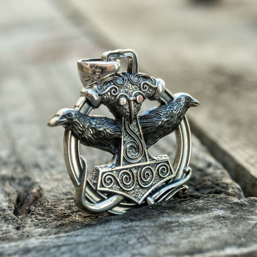 Thor's Pendant in silver, featuring the famous hammer of the mythical Nordic thunder god and two ravens, Hugin and Munin.