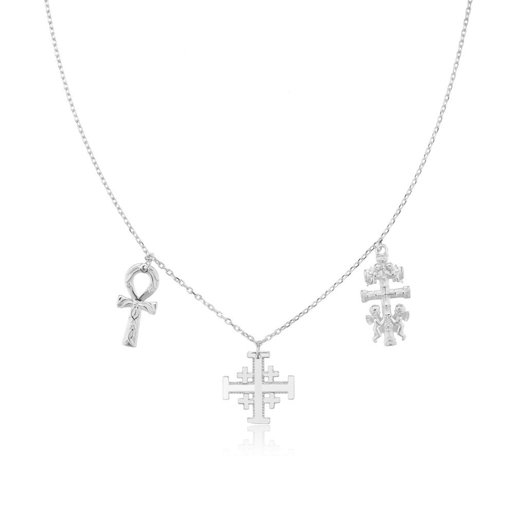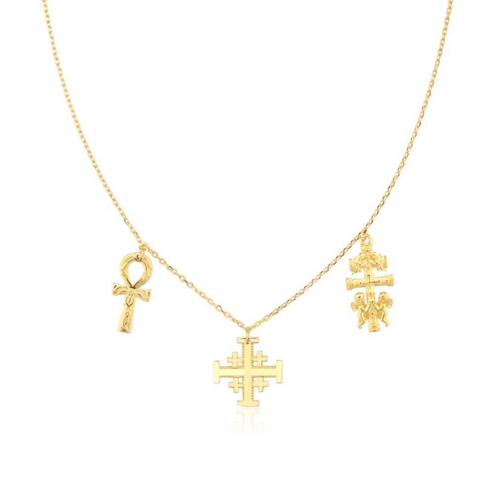 This necklace, which features the ankh cross, the Jerusalem cross, and the Lorraine cross, has a completely different style from what we normally offer. It mixes various styles.