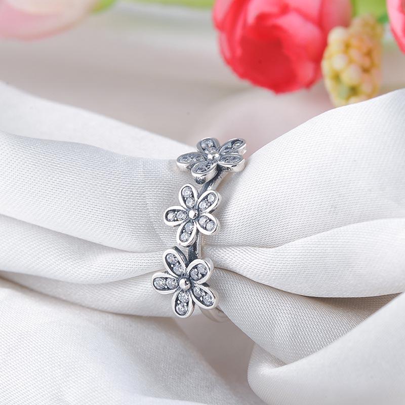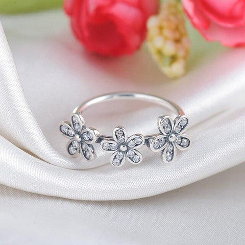 This piece made of solid silver alloy features three small flowers adorned with sparkling crystals, offering a completely new touch to your look. Furthermore, the frame of this ring is carefully polished.