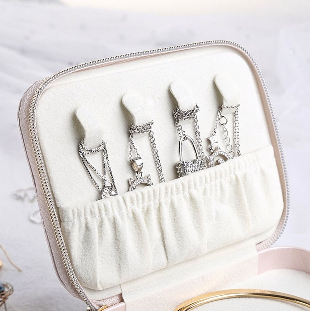 Thanks to the practical built-in mirror, you can showcase your jewellery effortlessly, wherever you are. The double zippers add extra security and allow easy access to your treasures.