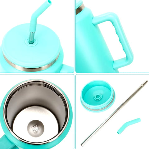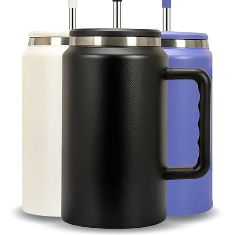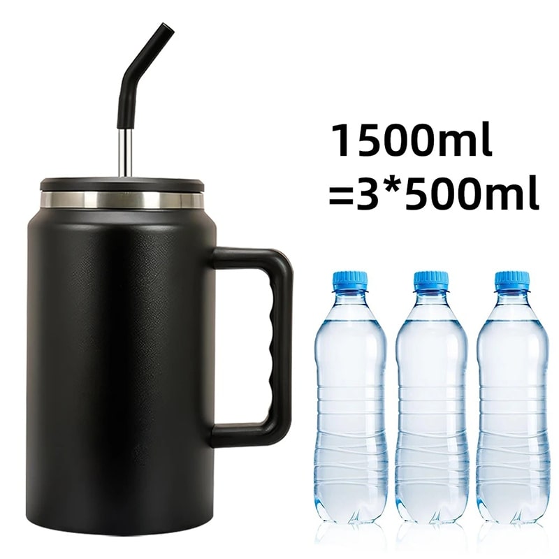 This large travel mug with a straw, modern and stylish, is perfect for those who want to keep their drink handy throughout the day. Its huge 1500 ml capacity ensures you'll have enough drink for a day at work, a long walk or a city tour. Despite its generous size, the compact and wide design makes it easy to carry, and the sturdy handle ensures a good grip on the move.