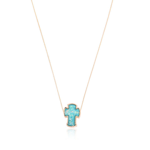Necklace with a cross that evokes the turquoise blue of lagoons.